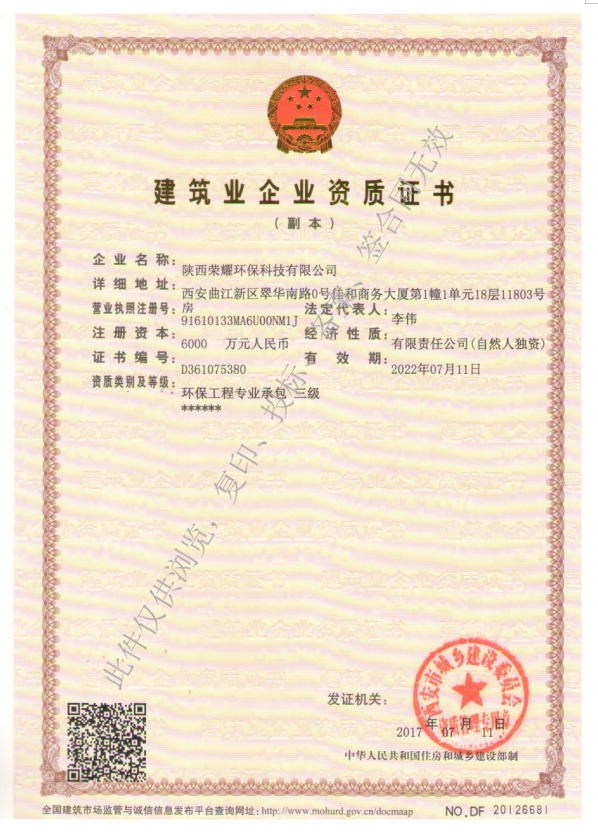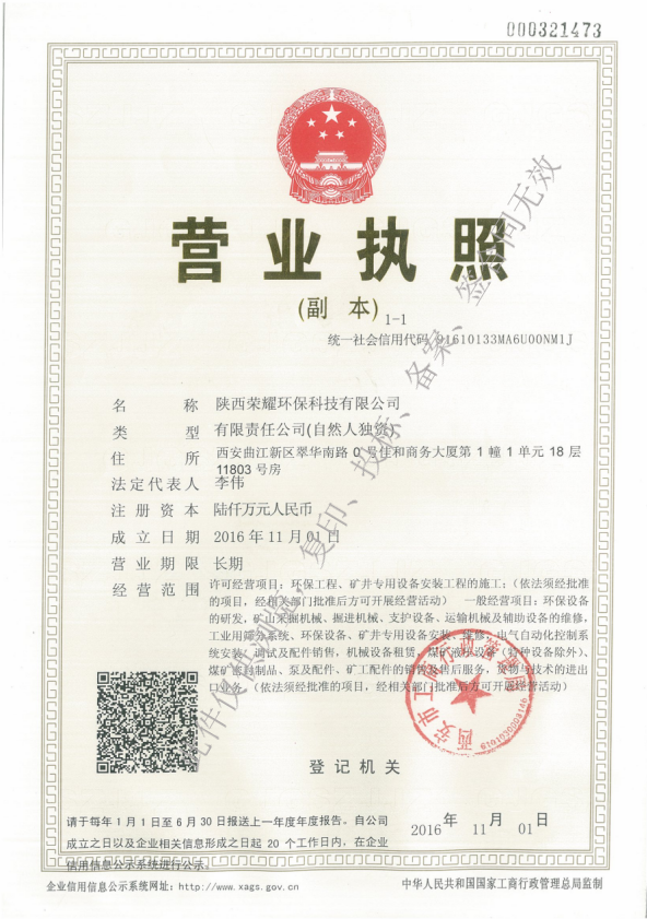 陕西荣耀环保科技有限公司成立于2016年11月1日,注册资本6000万元,公司位于陕西省西安市曲江新区翠华南路0号佳和商务大厦第1幢1单元18层11803号房。许可经营项目:环保工程、矿井专用设备安装工程的施工;一般经营项目:环保设备的研发、矿山采掘机械、运输机械及辅助设备的维修、矿井专用设备的安装、维修、电气自动化控制系统。